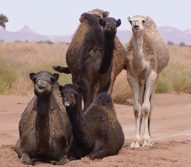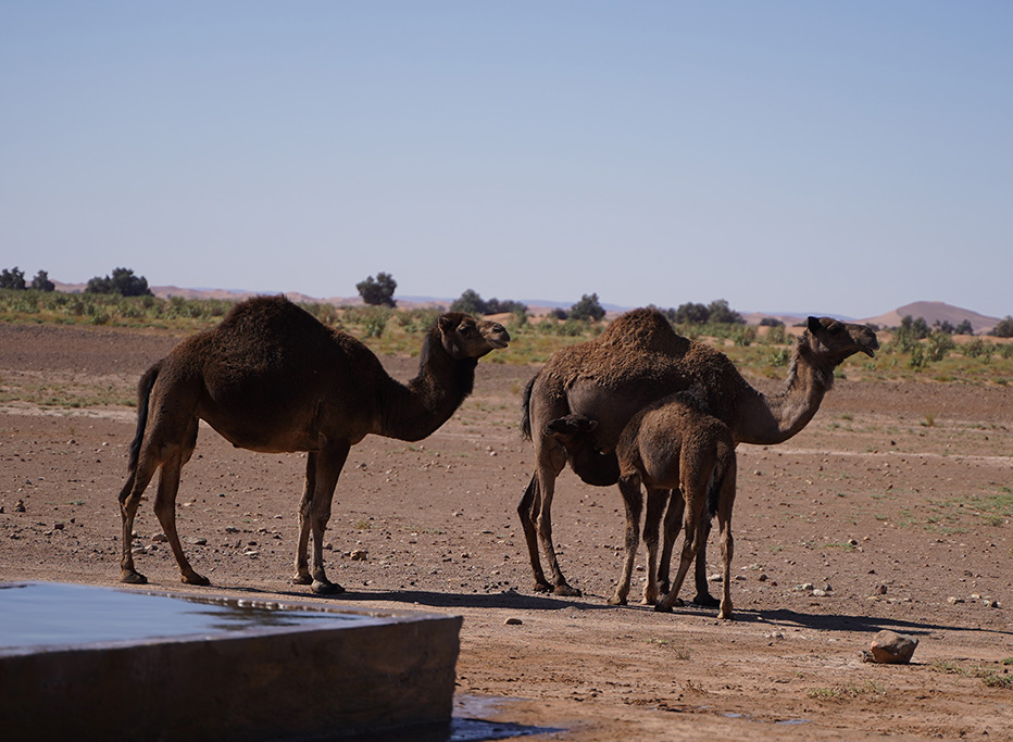 Tout au long nous rencontrons , des dromadaires sur les pistes du désert ,qui déambulent,et des oiseaux migrateurs sur le lac de Merzouga. Nous assistons a un bal de cigognes qui nous a ravit. Sur les étales ,se prélassent des chats , et d’autres dorment enlacés dans un carton.
